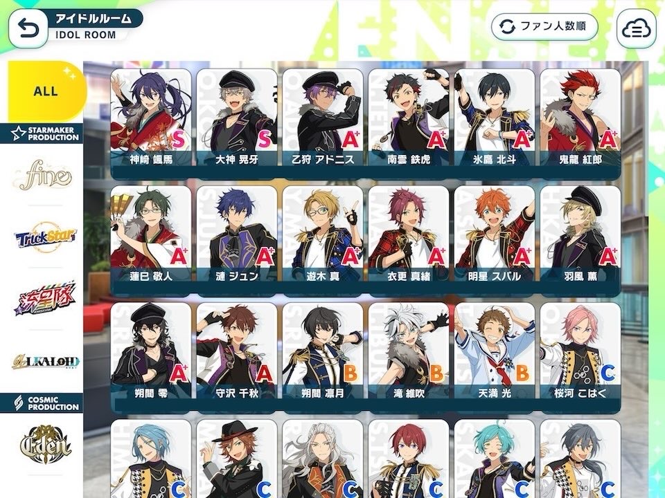 この画像の中で一番ファン人数に差があるところは意外だけど晃牙とアドニスくん。